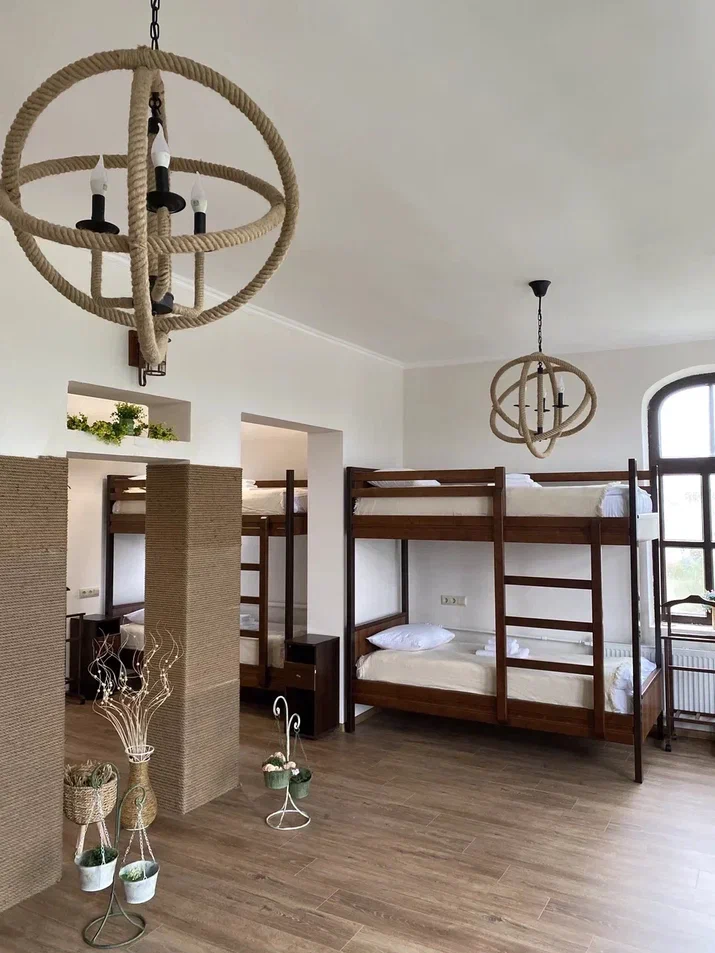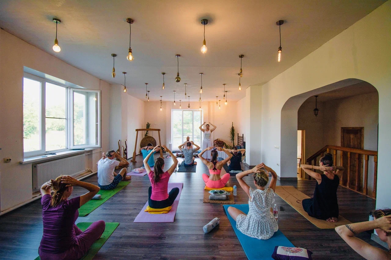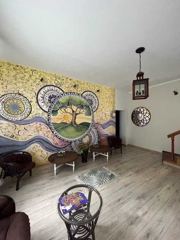 Дом мы оформили в ЭКО стиле. Внутри расставили мебель из натуральных материалов. Спальни в доме просторные. Зал для практик освещается естественным светом через панорамные окна. На территории мы создали беседки, клумбы, скульптуры, фонтан, шезлонги и площадку для игры в волейбол.