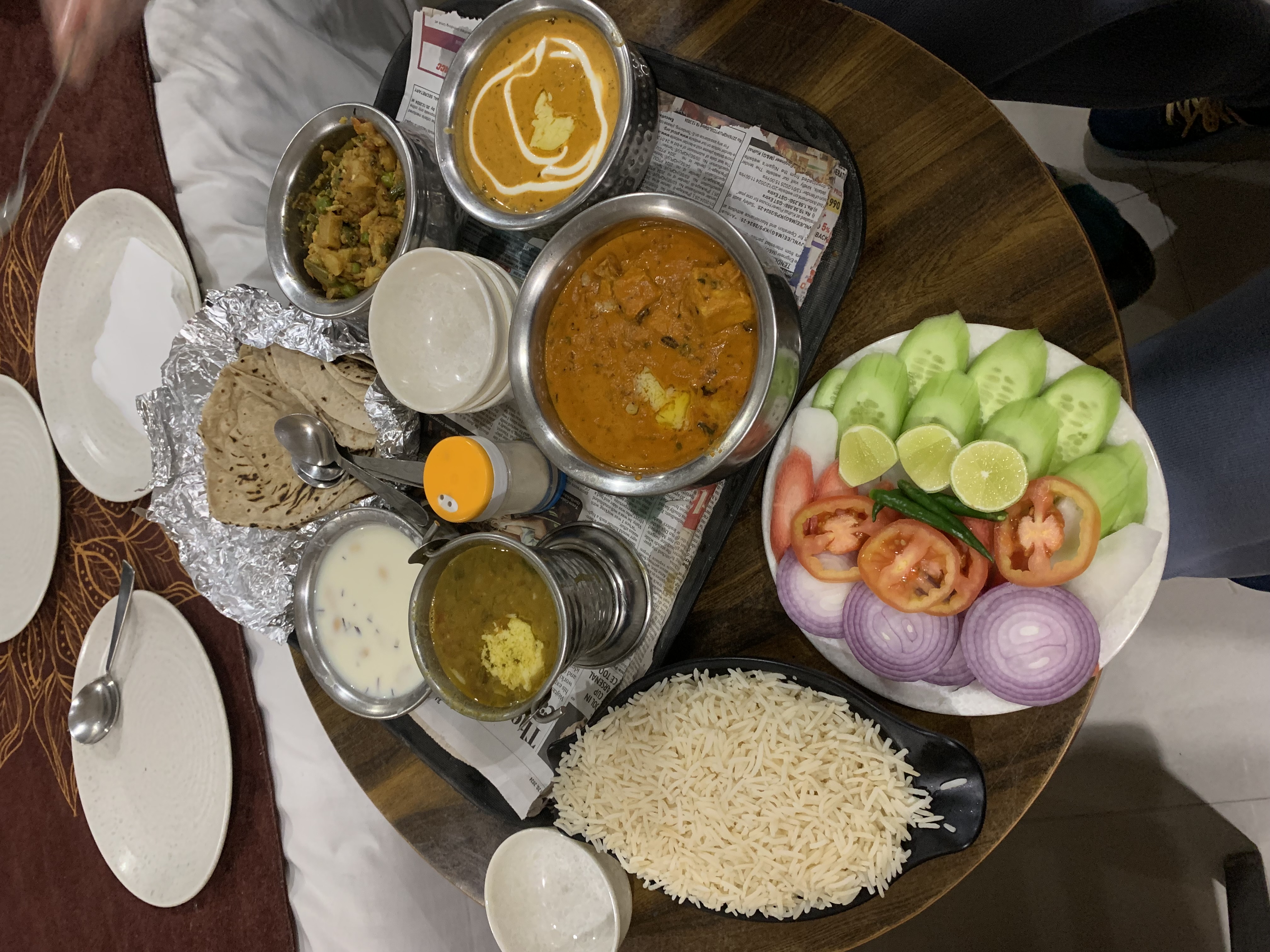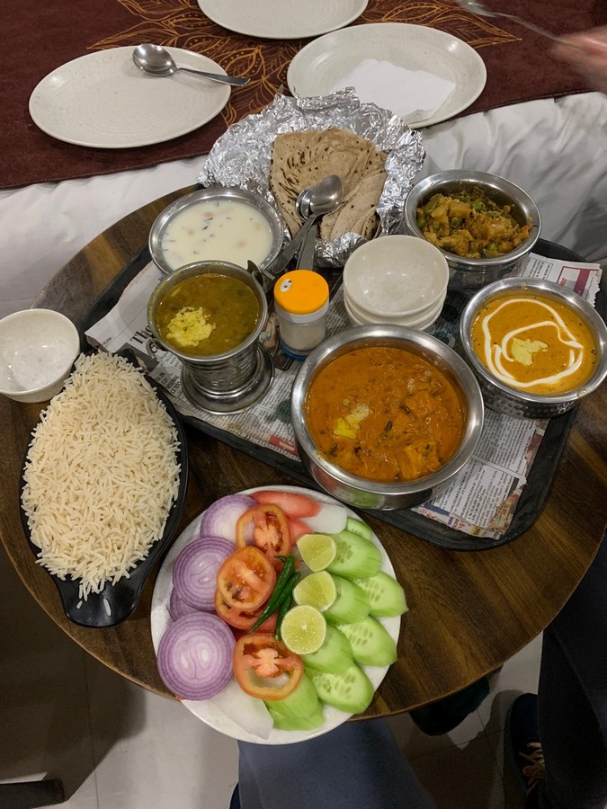 Обед - ужин - рис, овощи, курица или рыба, любой напиток, свежие соки, кофе, чаи любые, ласси любые на выбор.